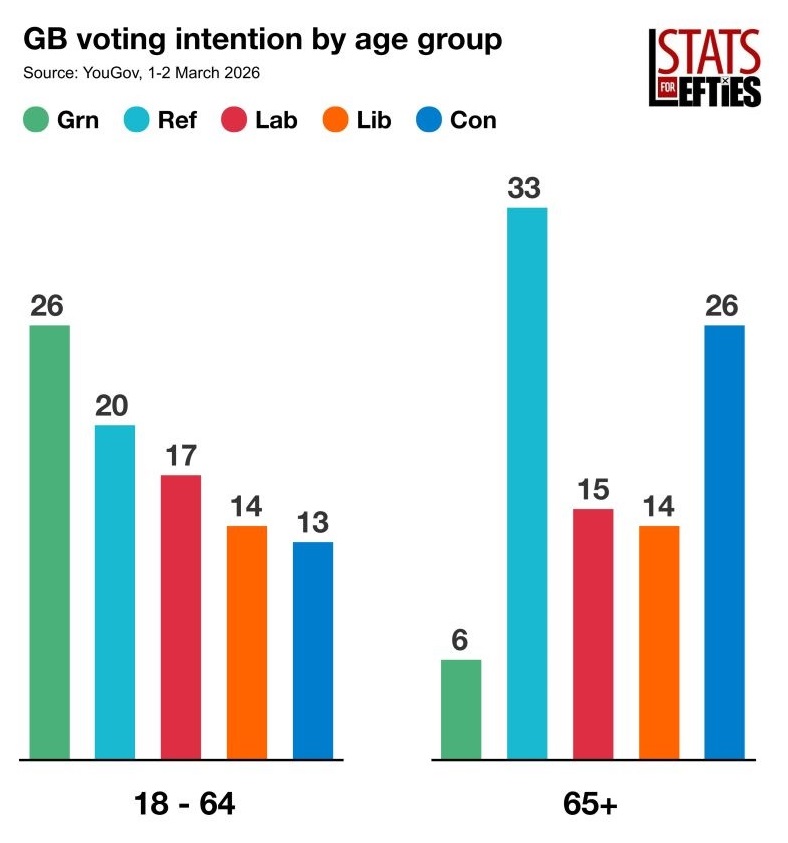 I am absolutely confounded by the degree to which Reform come out ahead of all the other parties, and further distressed by another S4L offering on the age factor (not stated what the column totals signify, but percentage points?):