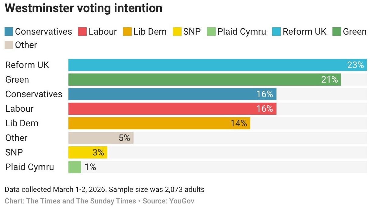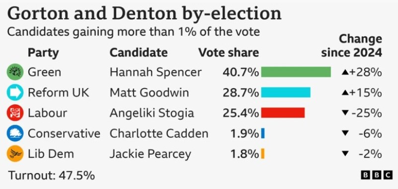 That's right - the odds-on Greens lead, followed by Reform, then Labour, whose majority was 13,413 in July 2024 and now look likely to lose the seat. Labour continue to say that a vote for the Green Party is a vote for Reform. On the contrary, in Gorton a vote for Labour is a vote for Reform. Jeremy Corbyn has - no surprise - told would-be-Your-Party-ists (no candidate on offer) to back the Greens, not Labour. An indication of the seriousness with which the right take the Green challenge can be seen at the Daily Mail. Here's their little eye-catcher: