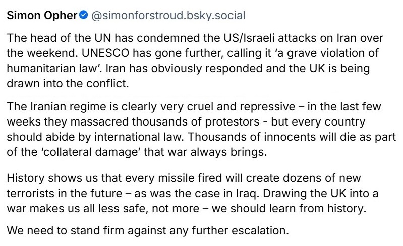 Stroud's Labour MP Simon Opher also posted yesterday on Bluesky: