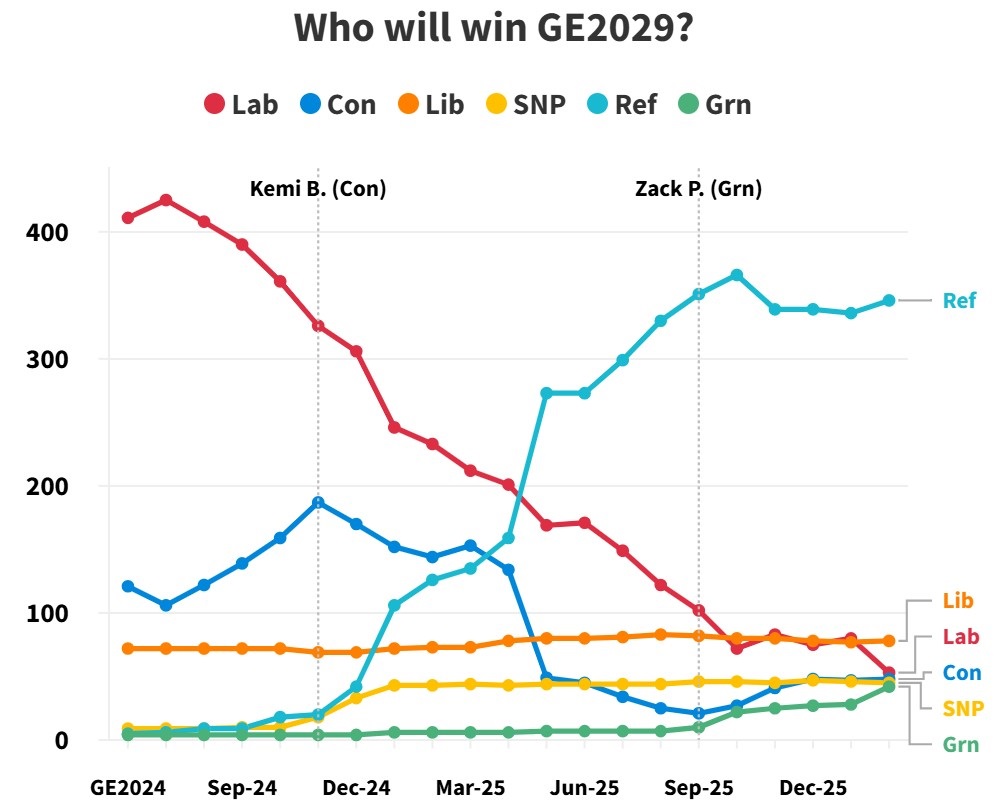 The striking - and pleasing in this house - feature here is how the Greens have advanced in recent weeks, as we've seen with Hannah Spencer's triumph in Gorton & Denton. Reform, appallingly, trumps Green. Which gets worse with this one from Stats for Lefties predicting the next General Election outcome (seats on the Y axis):